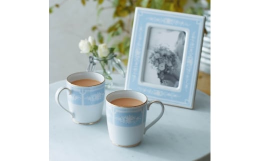 幸せな結婚生活を送るために古くからヨーロッパに伝わる4つのおまじない「Something Four」の中の「Something Blue」にちなんで、清潔感あふれるペールブルーをメインカラーとして使用しています。青は清らかさを象徴する幸せの色。青色を密かに身につけて幸せを願う花嫁の気持ちを反映したデザインです。花嫁のドレスを連想させるエレガントなレース模様を、ノリタケの誇る美しい「白盛技法」で表現しました。
