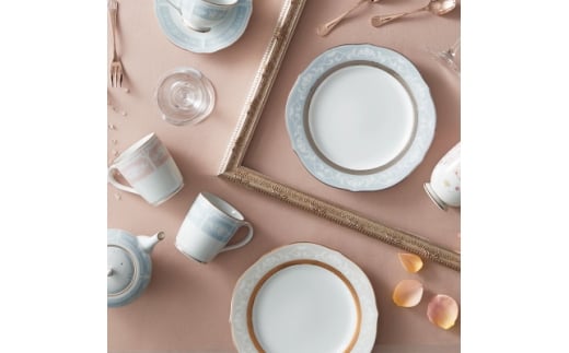 やさしいペールブルーに高級感を添えるのは、立体感と繊細さをあわせもつ「白盛」技法。ノリタケが得意とする技法のひとつです。この技法で表現されたレースやブーケ模様が上品でエレガントな雰囲気。清潔感のあるブルーを基調としながらも、あたたかみを感じる器となるよう、差し色にほんのり淡いベビーピンクを施しています。一見王道フェミニンなデザインですが、細部にわたりこだわりを尽くした、長く飽きることなくお使いいただけるデザインです。