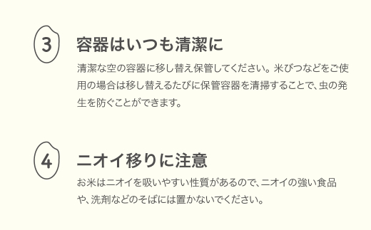お米はニオイを吸いやすい性質があるため、ニオイの強いものと一緒に保管しないようご注意ください。