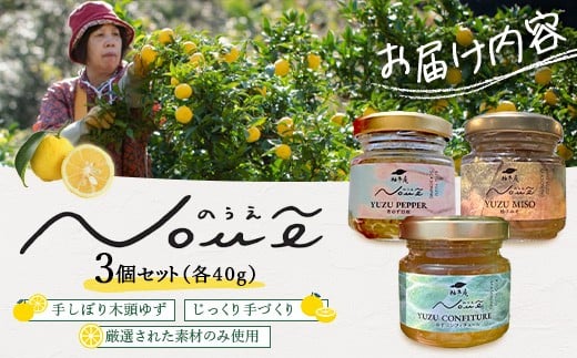 NOUE 3個セット 各40g(青ゆず胡椒・ゆずコンフィチュール・柚子みそ)【徳島県 那賀町 木頭ゆず 柚子 ユズ 木頭柚子 果物 国産 100% 調味料 柚子胡椒 ゆず胡椒 ゆずみそ 柚子味噌 ジャム ゆずジャム 瓶詰め 果汁 ギフト プレゼント お取り寄せ 柚冬庵】YA-80