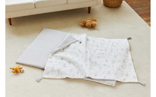 オールシーズン使いやすいタッセル付きのガーゼケット。 リバーシブル仕様で気分によって使い分けが可能です。約90×110cmのベビーベッドにも使いやすいサイズ感。 通気性・肌触りの良いダブルガーゼ。
