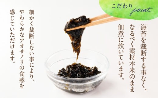 鹿児島県産の良質なアオサを、鹿児島県産の粗糖やオリジナルの醤油で、食感を大切に炊き上げました。