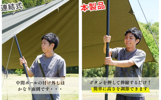プッシュボタン式の伸縮ポールを使えば、誰でも簡単にタープを綺麗に貼る事ができます。