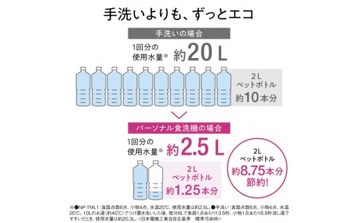 ***[NP-TML1]食器点数6点・小物4点、水温20℃、食器洗い機専用洗剤を2 g使用する(1箱600 g入り475円(税込))(当社調べ)。使用水量は約2.5 L。[手洗い]食器点数6点・小物4点、水温20℃、10 Lのお湯(約40℃)につけ置き洗いした後、洗剤を1.4 mL使用(1本315 mL入り197円(税込))(日本電機工業会調べ)して洗い、毎分6Lで食器1点当たり13.5秒、小物1点当たり5.5秒流し湯ですすいだとき、使用水量は約20.3 L。〈日本電機工業会自主基準 標準汚染時〉[2024年7月現在]