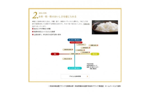 「コシヒカリを超える極良食味品種」をコンセプトに、食味に徹底的にこだわって開発されました。 その優れた食味と存在感で秋田米の牽引役となることが期待されています。素晴らしい食味の良さに加え、外観・香り・食感のバランスにも優れた、“米どころ秋田”が自信を持ってお届けする特別なお米です。その一粒一粒のおいしさに、秋田の地力がつまっています。