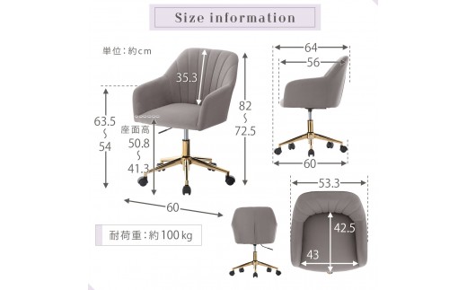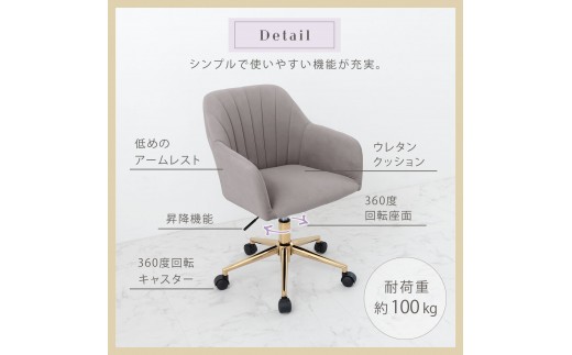 ベロアの張地とゴールド脚がおしゃれなキャスター付きデスクチェアです。