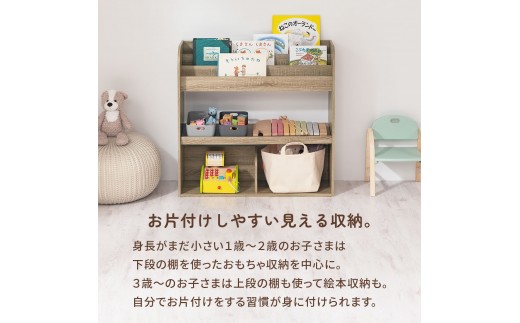 絵本やおもちゃをまとめて収納できるオープンラック。可動棚を用途に合わせて水平・ななめに調節することができます。
