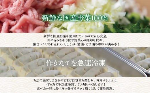 おせちの千賀屋がプロデュースするラーメン店「麺Lab千賀商店」で人気の絶品餃子をご自宅で! お店の美味しさをそのままご自宅でお楽しみいただけるように、 作りたてを急速冷凍してお届けいたします! 【原材料】 野菜(キャベツ、たまねぎ、にら、白ねぎ、しょうが、にんにく)、豚肉、ごま油、しょうゆ、食塩、こしょう、皮(小麦粉(国内製造)、でん粉、食塩)/酒精、調味料(アミノ酸)、pH調整剤、(一部に小麦・ごま・大豆・豚肉を含む)