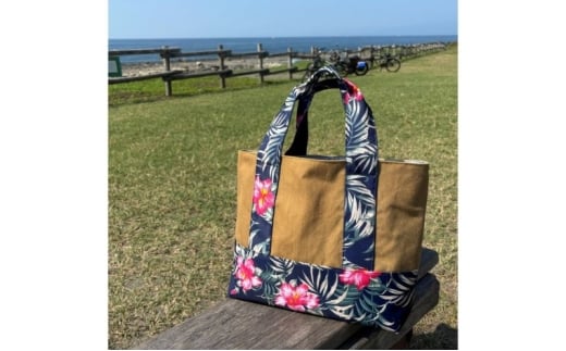 このトートバッグは、茅ヶ崎市で役目を終えた消防服(防火衣)をアップサイクルし、ハワイアンテイストのアロハ柄と組み合わせた一点もの。