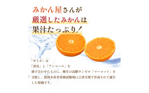 「せとか」は「清見」と「アンコール」を掛け合わせたものに、晩生の高糖タンゼロ「マーコット」を交配し、農林水産省果樹試験場口之津支場で育成されて誕生した柑橘です。