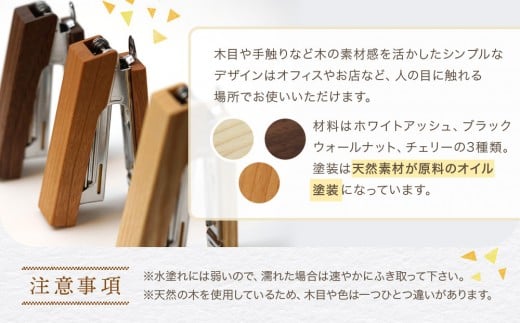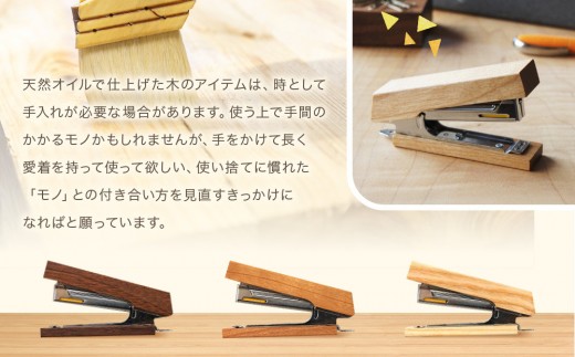 ずっと作りたいと思いながらやっと形になったステープラーは、作家自身のお気に入りのアイテムです。 木目や手触りなど、木ならではの素材感を活かしたシンプルなデザインは場所を選ばず、オフィスやお店など、人の目に触れる場所でも安心してお使いいただけます。