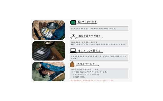 適度な湿度を保つソフトな暖房。沸騰したお湯を入れるだけなので、一酸化炭素中毒の心配がありません。カバーは保温性が高く、軽量で優しい肌触り。