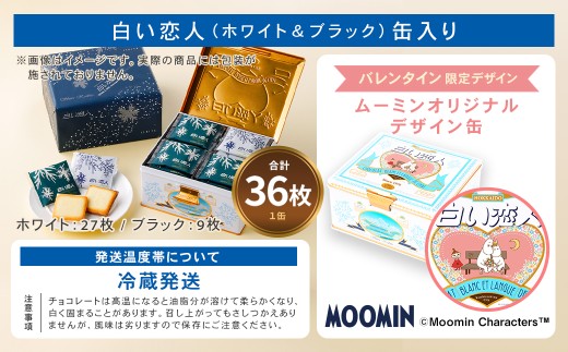 ムーミン オリジナルデザイン 白い恋人36枚缶 バレンタイン限定デザイン (ホワイト:27枚、ブラック:9枚) お菓子 おかし 洋菓子 スイーツ おやつ バレンタイン チョコレート 【2026年1月下旬~2月上旬頃にお届け】