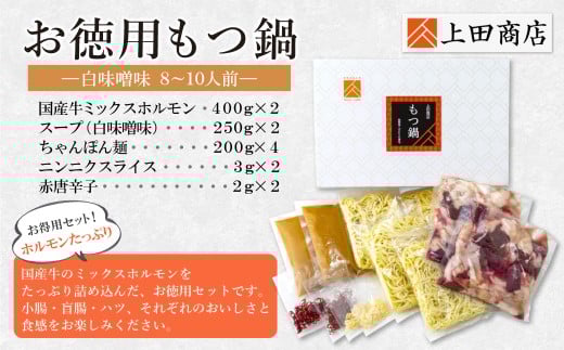W08-31 上田商店 お徳用もつ鍋セット(白味噌味)8~10人前 国産牛 モツ鍋 ミックスホルモン コラーゲン 冷凍 大容量 博多 福岡グルメ グルメ 鍋 鍋セット モツ鍋 福智町 送料無料 福岡県 2358782 - 福岡県福智町