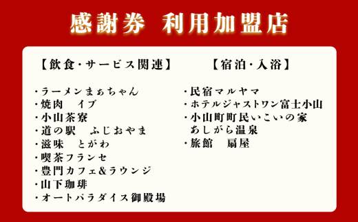 静岡県小山町内で利用可能な感謝券がふるさと納税に登場しました! お買い物やお食事、宿泊などにご利用いただけます。 【注意】 ・本券は「おやまふるさと納税感謝券利用加盟店」で使用できますが、返礼品基準に適合する品目やサービスとのみ交換が可能です。 ・本券でのお支払いにつきまして、釣銭はお出しできません。 ・本券の盗難・紛失又は棄損に対し、小山町及び発行者はその責任を負わず、また、原則再発行はできません。 ・本券と現金の引き換え及び未使用券の払い戻しはできません。 ・本券の利用期限は、券面に記載のとおりです。 有効期限:発行から1年間 発行者:(株)まちづくり公社おやま(小山町小山289-1|TEL:0550-76-6140)