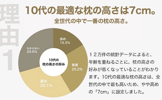 10代は、枕の高さは普通よりも高めを好み、枕の柔らかさは比較的柔らかめを好む傾向にあります。10代の好みの傾向を反映して、高さがありながらも、ふんわり柔らかい、そんな心地よさを追求した枕に仕上げています。