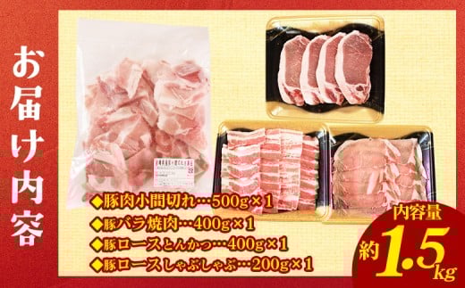 - <宮崎県産 豚肉4種セット 1.5kg>ロースしゃぶしゃぶ とんかつ バラ焼肉 小間切れ 冷凍 国産 便利な小分けパック ぶた ブタ 豚こま切れ 切り落とし 炒め物 豚汁 生姜焼き 野菜炒め 使いやすい 色々な部位【MI662-nh】【日本ハムマーケティング株式会社】