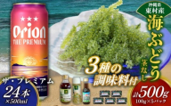 東村を楽しむセット!海ぶどうセット(茎あり)1kg&調味料3種&ザ・プレミアム500ml×24本 海ブドウ 海ぶどう うみぶどう パック 茎あり クビレズタ たれ付き 海鮮 海藻 プチプチ おつまみ オリオン orion ビール オリオンビール 1ケース 酒 常温 沖縄県 東村