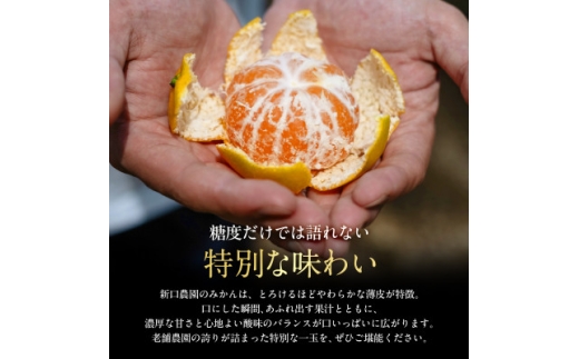 新口農園のみかんは、ただ甘いだけではありません。とろけるほどやわらかな薄皮が特徴で、口にした瞬間、果汁があふれ出し、濃厚な甘さと心地よい酸味が絶妙なバランスで広がります。老舗農園の誇りが詰まった、飽きのこない味わいをぜひご堪能ください。
