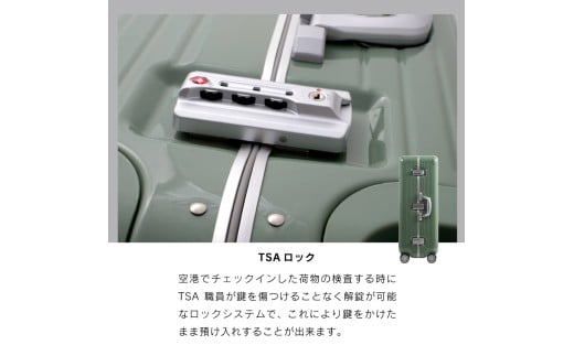 ロック部分はTSAロックを搭載。荷崩れを防ぐ仕切り板とクロスベルトは両側にそれぞれついており収納能力に優れています。