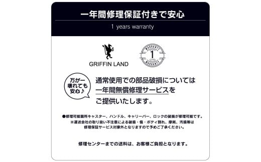 通常使用での部品破損については一年間無償修理サービスをご提供いたします。キャスター、ハンドル、キャリーバー、ロックの破損が修理可能です。