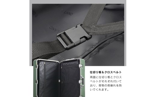 ロック部分はTSAロックを搭載。荷崩れを防ぐ仕切り板とクロスベルトは両側にそれぞれついており収納能力に優れています。