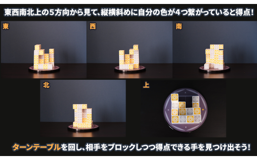 ターンテーブルを回しながら、東西南北と「上」からの5方向を使い、縦・横・斜めに自分の色を揃える独特のルール。