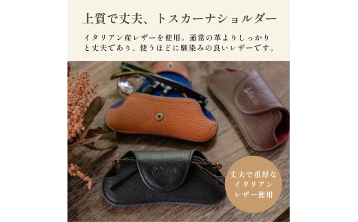 イタリアンレザー・トスカーナショルダーを使ったレザーメガネケース。通常の皮より上質で丈夫でしっかりした高級レザーです。中には芯材を入れているため衝撃や摩耗を防止します。