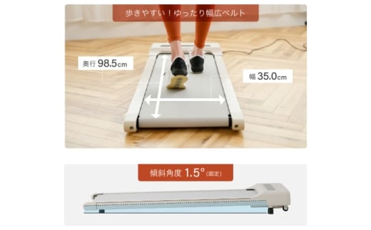 歩行面が幅35×奥行98.5cmで、運動初心者の方でも運動しやすい幅広サイズのベルトを採用。足元を気にせず、安全に運動することができます。