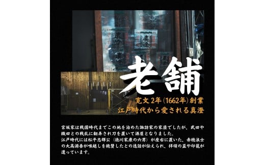 徳川家康の六男、松平忠輝公が座右に置いた、赤穂浪士の大高源吾が喉越しを絶賛したとの逸話が伝えられ、拝領の盃や印籠が遺っています。