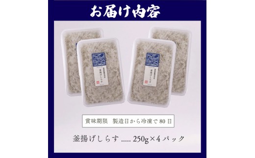 釜揚げしらす 250g 4パック 計 1000g 1kg 国産 しらす シラス 魚 魚介 新鮮 釜揚げ かまあげ 釜あげしらす 冷凍 冷凍しらす 小分け パック 冷凍食品 個包装 美味しい 送料無料 さかな お中元 お歳暮 ギフト プレゼント 贈答用 おすすめ お祝い 父の日 母の日 しらす丼 ご自宅用 家庭用 お手軽 ストック 新鮮 お手軽 簡単 贈り物 鮮度 静岡県 牧之原市 坂口産業株式会社