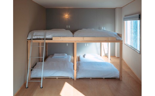 鹿沼のまちなかの宿泊施設。2段ベッドと作業デスクを配置した4人個室、シンプルな小上がりにデスクを完備した小さな個室、風呂トイレ付きゆったり広々大人6名個室の合計3部屋。お子様連れ歓迎、街歩きや観光にもオススメです。