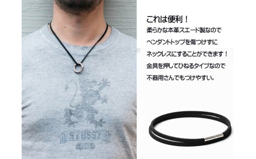 結婚指輪や大切な指輪を指にはめられない職業の方にも便利な革紐ネックレス。