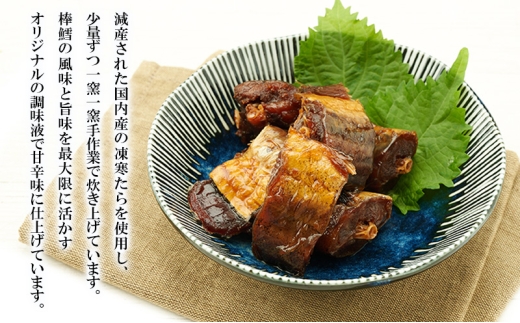 厳選された国内産の凍寒たらを使用し、少量ずつ一窯一窯手作業で炊き上げています。棒鱈の風味と旨味を最大限に活かすオリジナルの調味液で甘辛味に仕上げています。