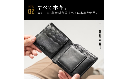 革部分すべてに本革を使用した贅沢な二つ折り財布。 小銭入れは縦型とBOX型の2タイプから選べます。 スリムな設計ながらカードやコインをしっかり収納でき、日常使いに最適です。
