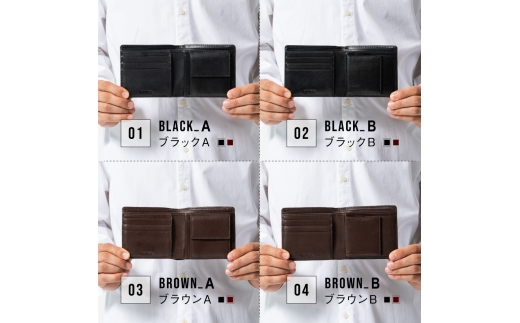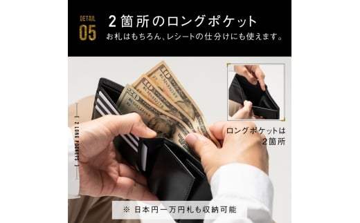 革部分すべてに本革を使用した贅沢な二つ折り財布。 小銭入れは縦型とBOX型の2タイプから選べます。 スリムな設計ながらカードやコインをしっかり収納でき、日常使いに最適です。