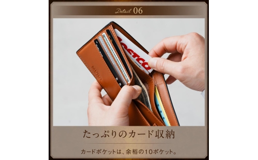 カーボンレザーとコードバン調仕上げが魅力の二つ折り財布。 大手ブランドも手掛ける工場で生産された高品質モデルです。 小銭入れは大きく開くBOX型で、中身が見やすく取り出しやすい設計になっています。