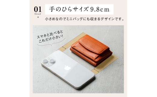 手のひらに収まる可愛い三つ折りミニ財布。 柔らかなイタリア製シュリンクレザーを使用し、上品な質感と使いやすさを両立しています。 カードは最大9枚、お札も約10枚入る実用的な収納力に加え、見やすいボックス型小銭入れを搭載。 スキミング防止機能付きで、旅行や人混みでも安心して使える頼もしいアイテムです。