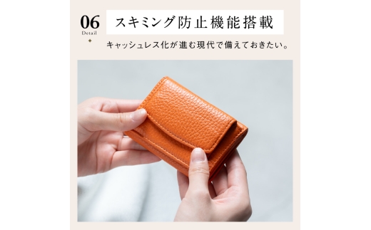 手のひらに収まる可愛い三つ折りミニ財布。 柔らかなイタリア製シュリンクレザーを使用し、上品な質感と使いやすさを両立しています。 カードは最大9枚、お札も約10枚入る実用的な収納力に加え、見やすいボックス型小銭入れを搭載。 スキミング防止機能付きで、旅行や人混みでも安心して使える頼もしいアイテムです。