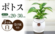3つの異なる色合いのポトスを白い円柱形の陶器鉢に植えました。