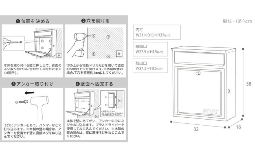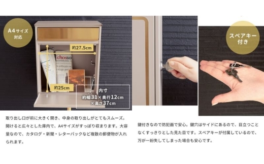 ゴールドステンレスの投函口と取出し口が高級感漂うおしゃれな壁掛けポストです。メール便・レターパック対応の大容量サイズで、A4サイズもすっぽり入ります。