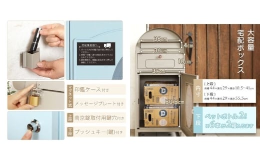 広幅の投函口は、A4サイズもラクラク入ります。下段の宅配ボックスは、2Lのペットボトル×6本入りが2箱も収まる大容量!