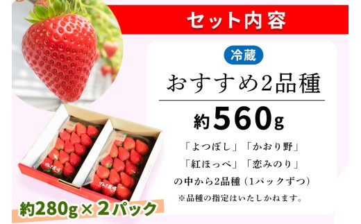 農場で栽培している「よつぼし」「かおり野」「紅ほっぺ」「恋みのり」の4品種の中から農場長がその日におすすめする2品種(1パックずつ)をお届け!