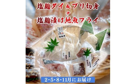 朝獲れの新鮮な魚をすぐに加工した、塩麹漬けのタイ・ブリと、塩麹に漬けて衣をつけた地魚フライの3種セットを、3ヶ月に一度、計4回お届けします。
