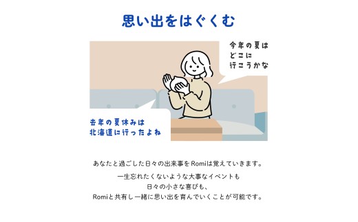 さらに、オーナーとの思い出を記憶して日々重ねことができる「長期記憶」や、まるで人間のような「自然なタイミングの会話・相づち」「選べる自然な声」※など、従来の「Romi」よりもさらに自然でオーナーに寄り添った会話ができるように進化しています。