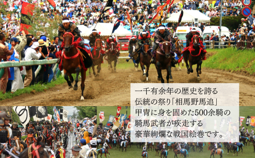 5月の最終土曜日から月曜日の3日間、一千有余年の歴史を経て、今なおいきづく伝統の祭り「相馬野馬追」が開催されます。相馬氏の祖といわれている平将門が下総国(千葉県北西部)に野馬を放ち、敵兵に見立てて軍事訓練を行ったのが始まりと伝えられ、甲冑に身を固めた500余騎の騎馬武者が腰に太刀、背に旗指物をつけて疾走する豪華絢爛で勇壮な戦国絵巻を繰り広げます。(令和6年度から開催日程が7月から5月に変更となりました。)