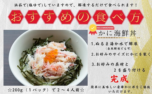 新鮮なタラバガニを浜茹で(塩ゆで)しむき身加工しました。解凍後すぐに食べれるので、お手軽にカニ軍艦やカニチャーハン、カニ丼など様々な料理にお使いいただけます。