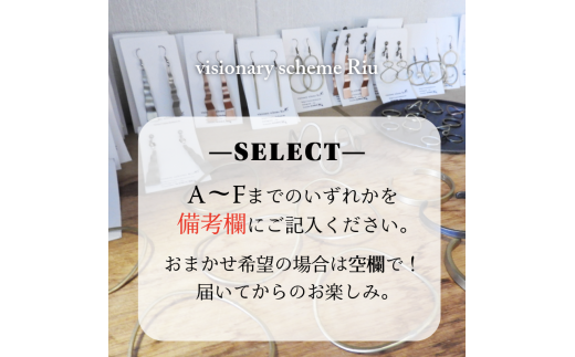 visionary scheme Riuオリジナルハンドメイドピアスです。 (イヤリングにも変更可) シンプルで様々な服装に合わせやすい、ハンドメイドのピアス。 職人が1つ1つ手作りした、シンプルなデザインのピアスとなっております。どんなファッションにも合わせやすく、どんなアクセサリーとも相性が良いと好評いただいております。 6種(A~F)の中からお好きなデザイン3種をお選び頂き、備考欄へ記入して下さい。 ※備考欄へ記載がない場合はおまかせで3種お届け致します。 ベース材質:真鍮(一部洋白、銅) 金具:メッキ 【ご注文前にご確認ください】 ※クリックポストでのお届けとなります。(お届け指定日の設定が不可となっております) ※真鍮は素材の特性上、経年により古い五円玉のように色がくすんできます。 ※1点1点手作りですので、見本画像と刻印位置や本体の曲げ部分等、  全体の雰囲気が若干異なる場合はございます。以上をご了承の上、ご注文ください。
