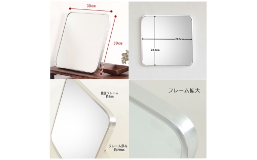 シンプルなデザインのアルミフレーム卓上ミラー。 サイズは本体30x30cm、鏡面は28.5x28.5cmでかなり大きめです。 壁掛けとしてもご使用頂けるように金具も付属しています。 壁側に取り付ける金具につきましては、壁の素材によって異なりますので 壁の素材に合わせた金具を別途ご購入下さい。 ※画像はイメージです。 ●地場産品類型3:市内にて企画、設計、検証を行い、台湾・中国にて製造・組立、その後輸入して、再び市内で最終検品、在庫品質管理、出荷を行っています。