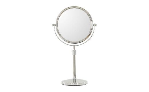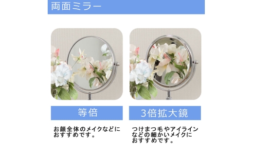 昇降卓上ミラー、コスメ用に最適。 高さが36cmから45cmまで調整できる卓上ミラーです。角度調整も簡単にできます。 ミラーは片面で1倍と片面で3倍の裏表の拡大鏡になっており、等倍のミラーはお顔全体のメイクに、3倍拡大鏡はつけまつげやアイラインなどの細かいメイクにおススメです。 ※画像はイメージです。 ●地場産品類型3:市内にて企画、設計、検証を行い、台湾・中国にて製造・組立、その後輸入して、再び市内で最終検品、在庫品質管理、出荷を行っています。